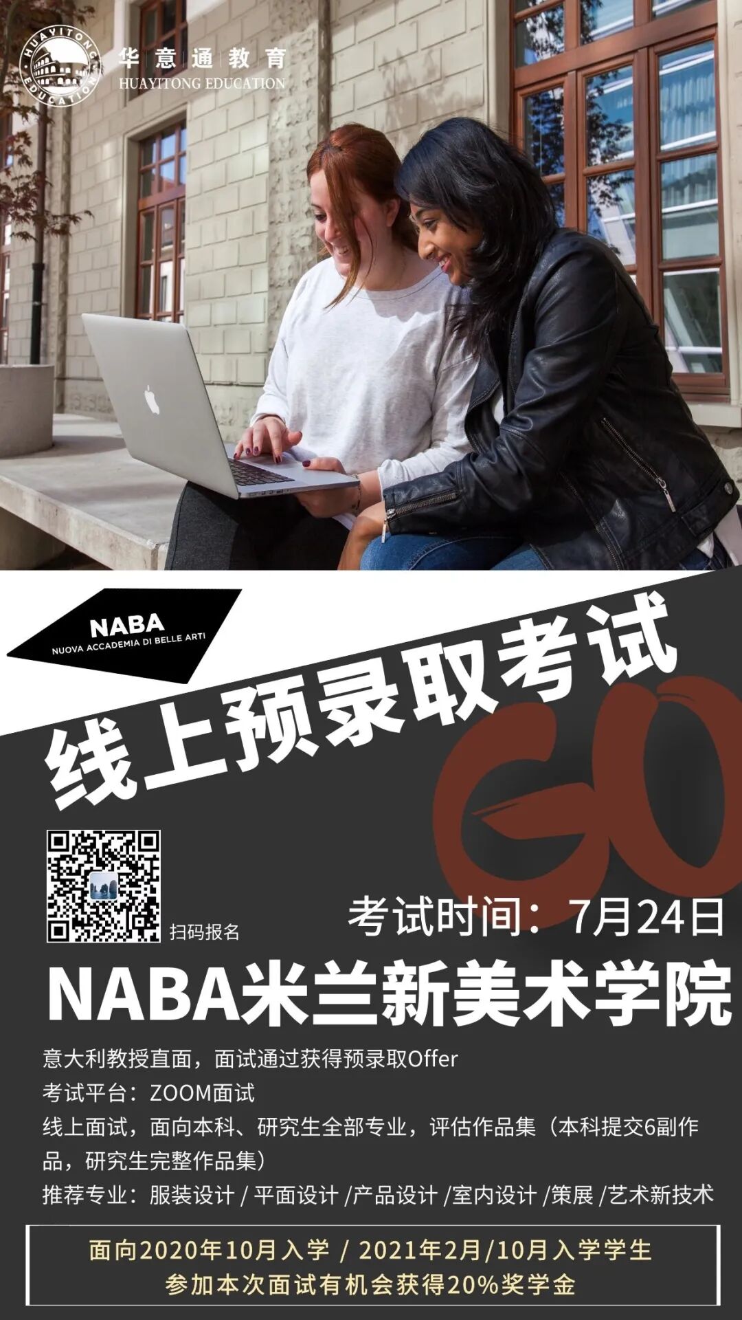 华意通是NABA官方的合作院校,录取非常有保障,并且参加面试优秀的学生还有机会获得华意通学生专享的额外20%奖学金!
