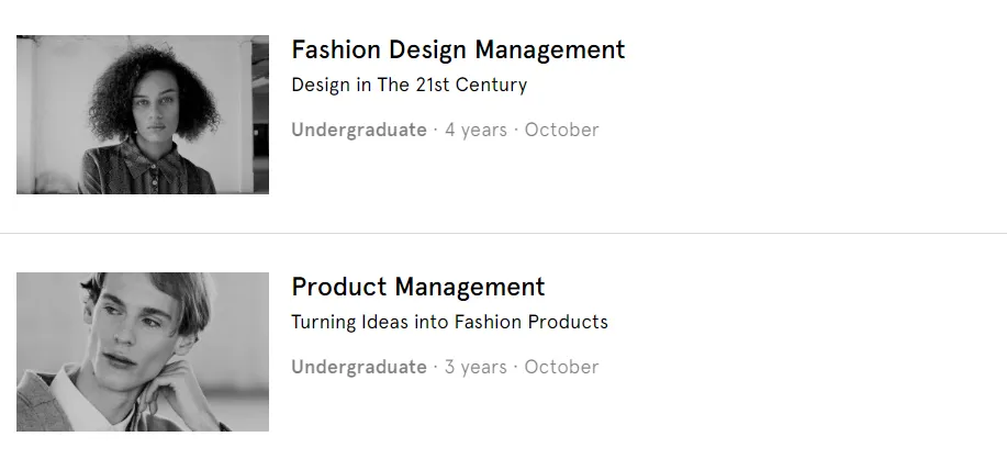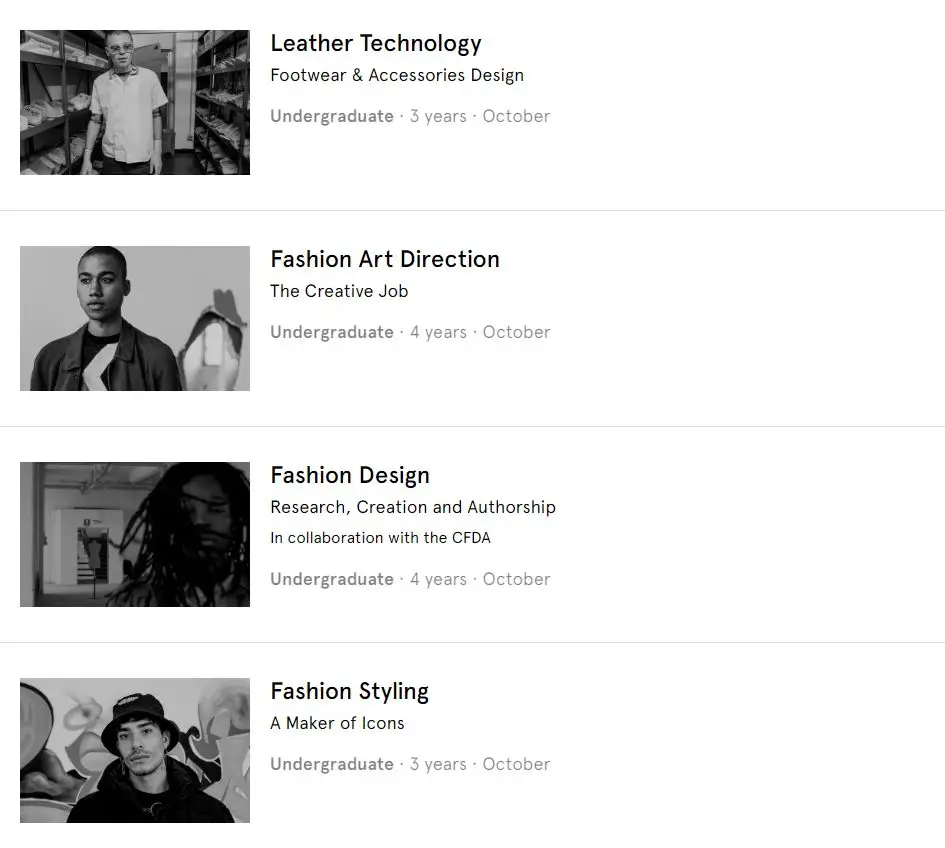 服装设计,服装系列设计,箱包设计,鞋履设计,针织品设计,时尚品牌管理,时尚市场营销与传播,国际时尚商业,奢侈品商业管理,时尚零售管理,时尚经济学,服装营销与买手,服装造型,时尚趋势预 测,时尚艺术指导,文化管理,创意指导,产品管理