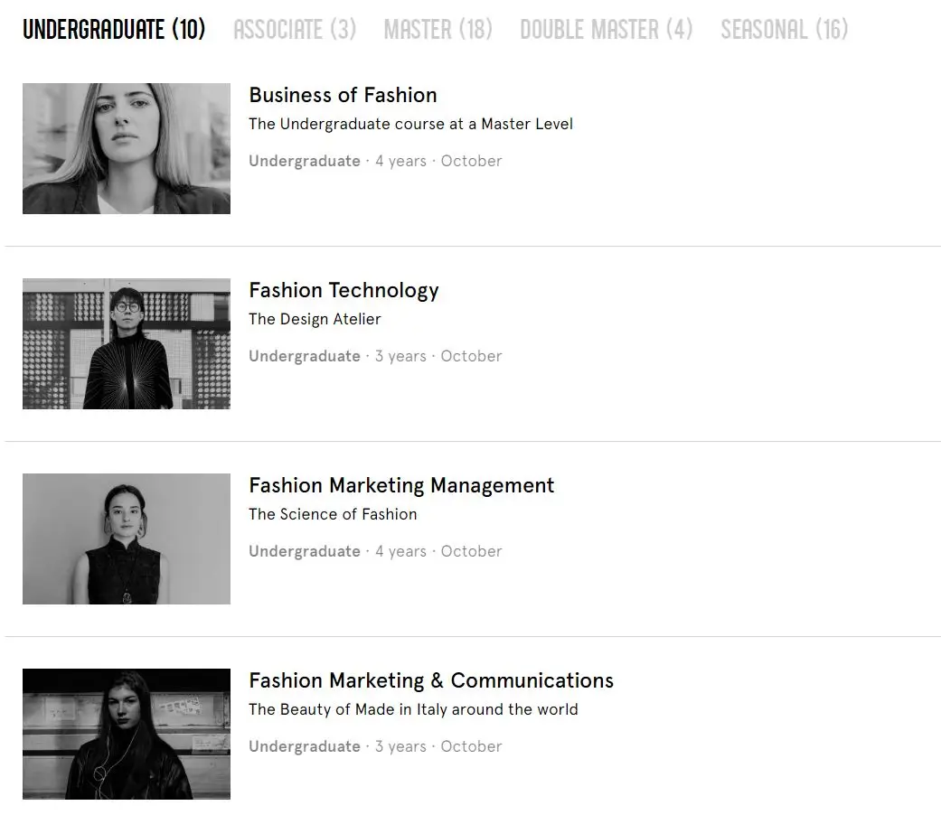 POLIMODA设有10个本科专业,有意大利语授课,也有英语授课或者双语授课专业,学制也分3年或4年,需要注意一下