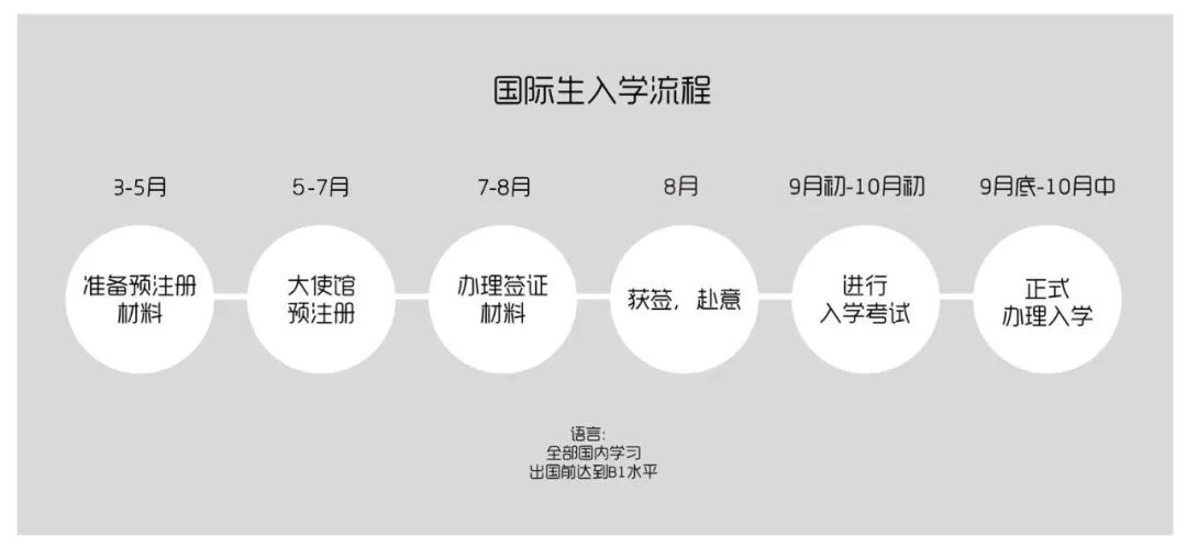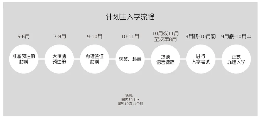 在当年的3-5月份准备留学申请材料,5-7月份在意大利大使馆进行预注册,7-8月份办理旅游签证前往意大利留学,9月份参加意大利大学入学测试和正式注册。