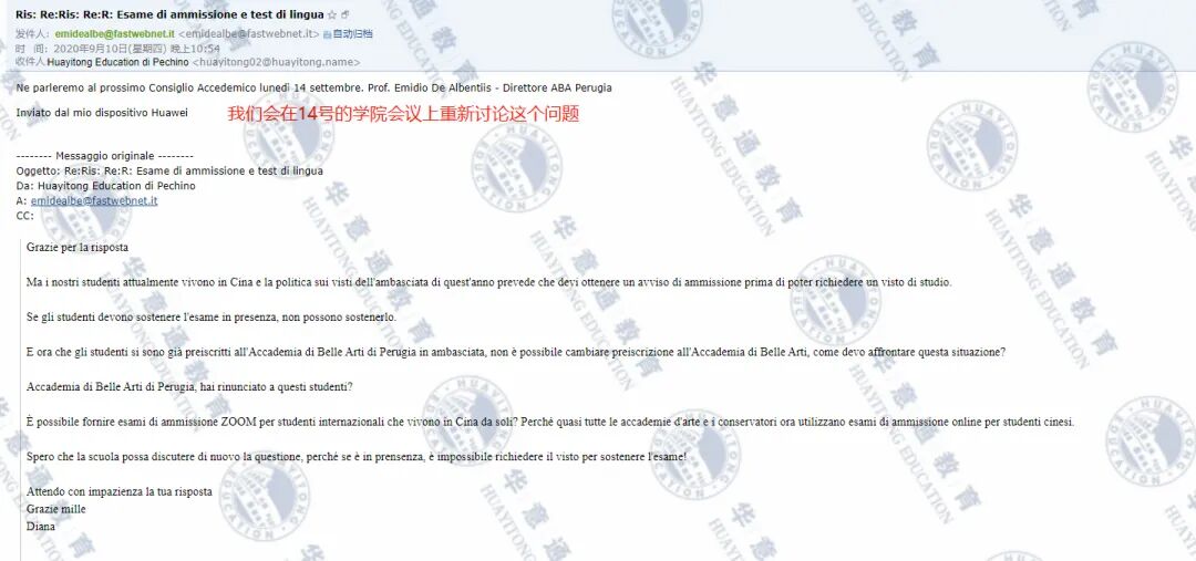 前后我们发了13封邮件在和佩鲁贾美术学院Battle,是否可以为中国学生开设线上入学考试。