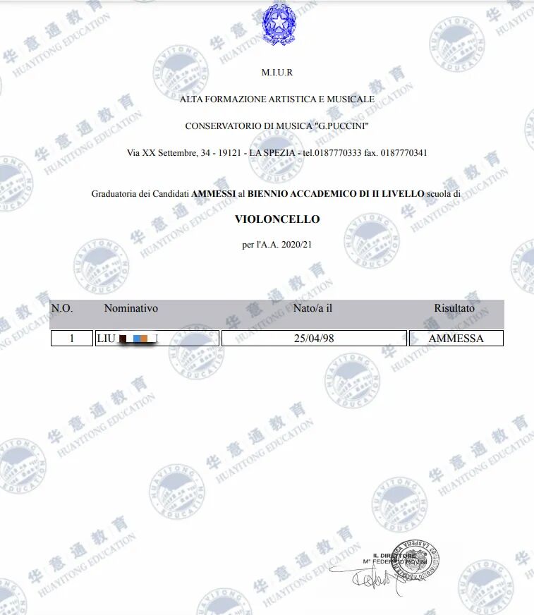 刘同学,拉斯佩齐亚音乐学院大提琴专业录取,研究生