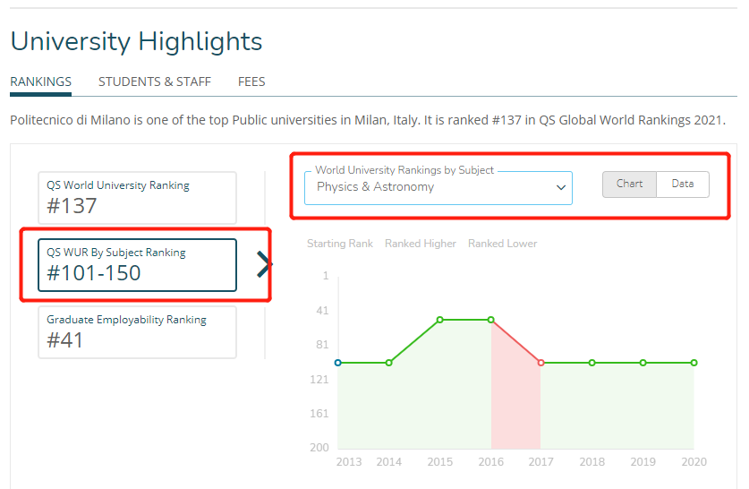两所学校都有不错的位置,一个常年稳居意大利第一,一个位列榜四。除了综合排名以外,再来看看物理学科在世界院校的排名,也均是很靠前的位置。