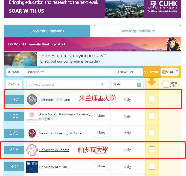 这两所意大利综合性大学在QS的排名: