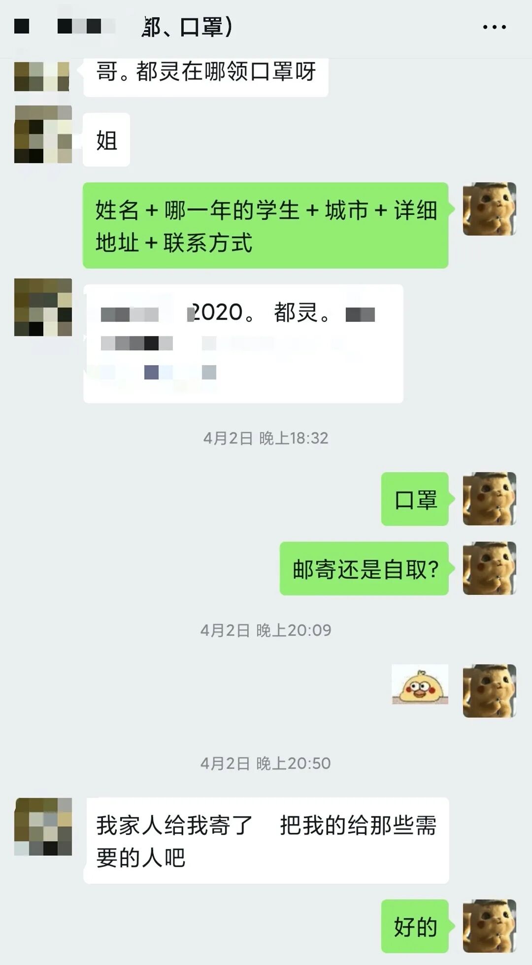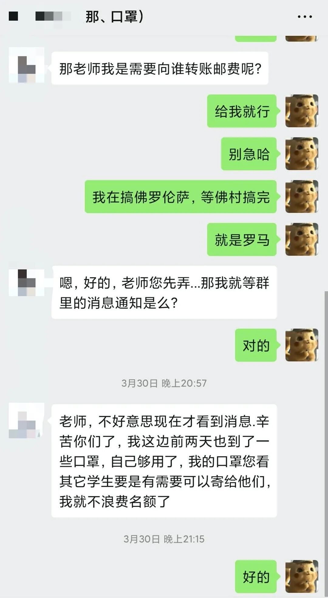 我们这次给学生免费送口罩只是想自已点自己的绵薄之力,有的人说我们作秀,说快递根本就出不去,也有人说我们只给自己学生,也有怀疑口罩质量的。