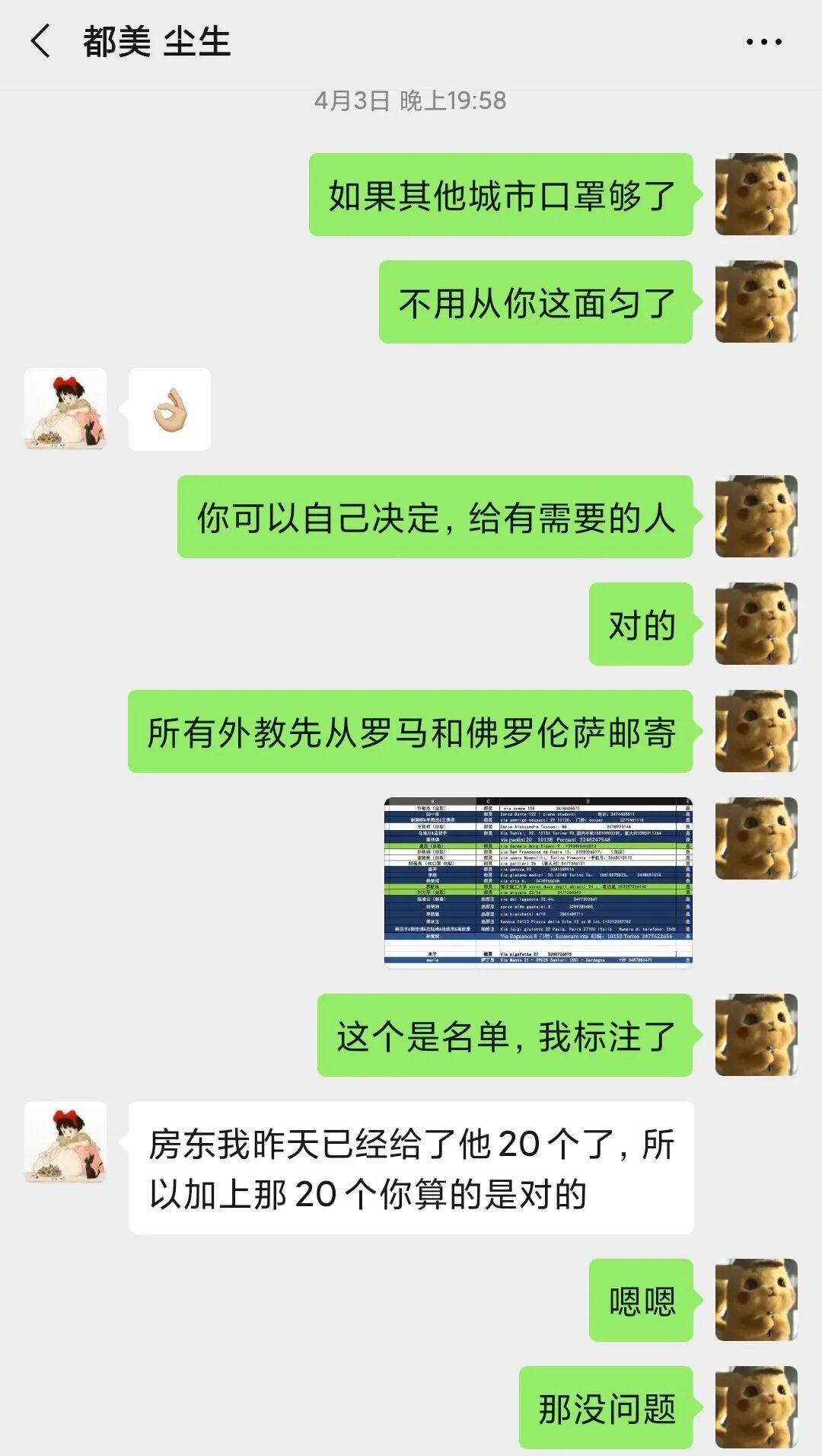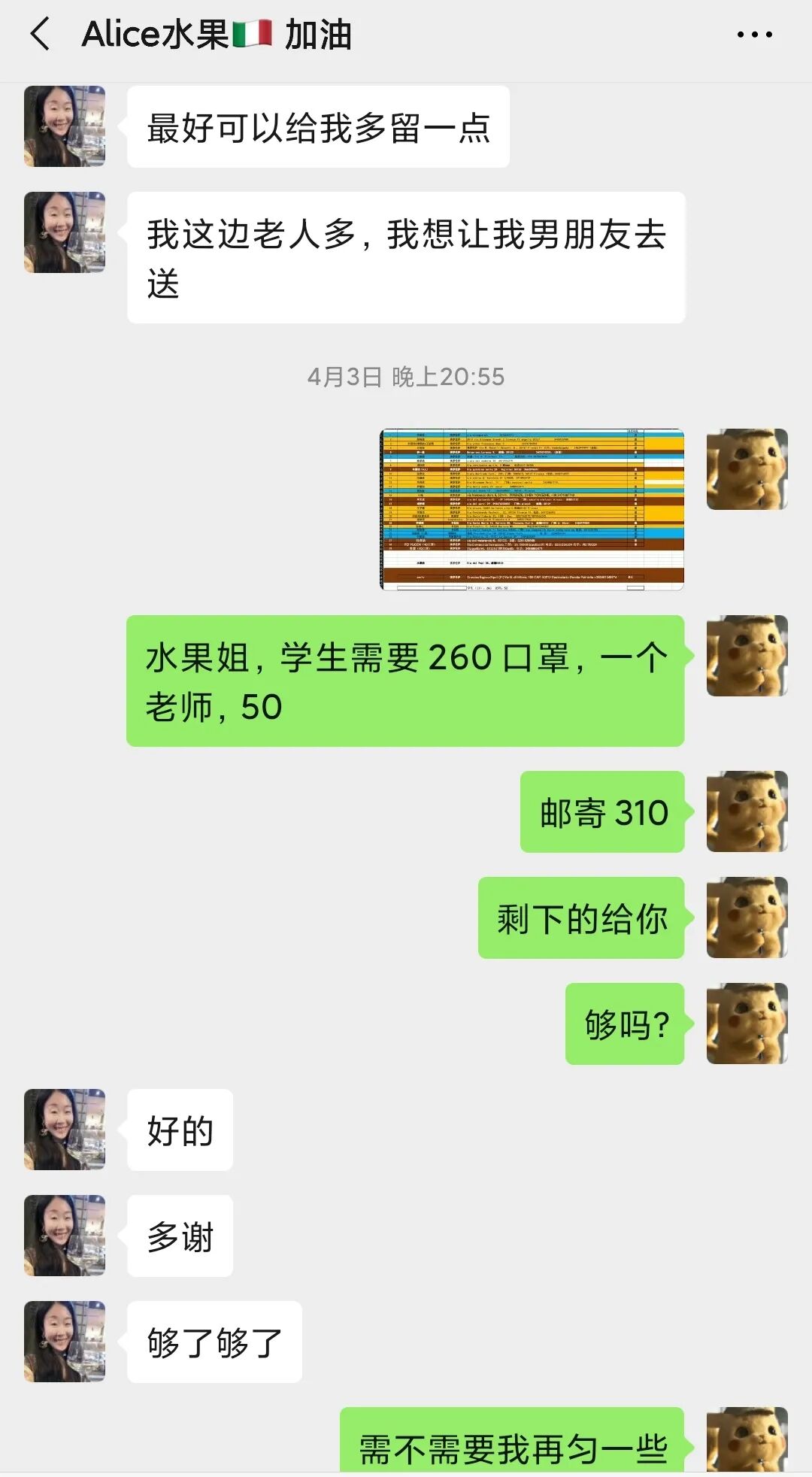 我们写的是给自己学生,但实际上,我们也将多余的口罩分给了很多不是华意通学生但是需要口罩的中国学生或者意大利人。