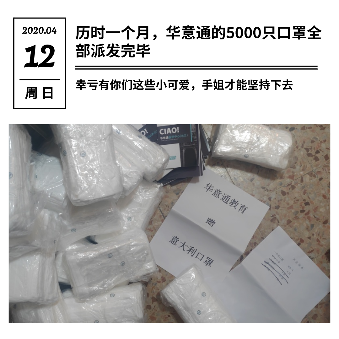 意大利疫情爆发已经快两个月了,从3月10日那天,华意通发了文章说要给意大利的华意通学生送口罩起,一直到今天,口罩的事才暂时告一段落。