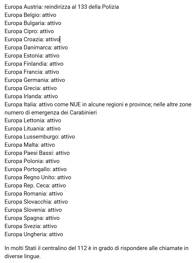 Europa Italia: attivo come NUE in alcune regioni e province; nelle altre zone è numero di emergenza dei Carabinieri.