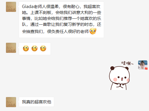 在学习语言的过程中,有一些单词和语法枯燥,GIADA老师总能将一些比较难懂的内容简单化,找出一些归纳总结的办法,梳理各种知识点,深入浅出,条理分明,她非常善于通过图表,图片等生动直观的方式来展现。学生们一直会津津有味的听课,消化知识的特别快!
