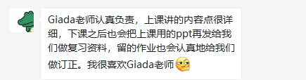 GIADA老师上课内容紧凑丰富,课堂效率高,学生们都能跟着老师的思路走,上课附有大量的例题和练习题,让同学们短时间就能掌握知识点!