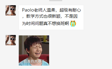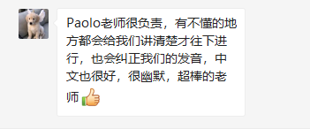 PAOLO老师对学生们的作业批改总结认真,能及时准确地发现学生们在学习过程中遇到的问题并认真讲解,解决问题。学生们遇到任何问题,PAOLO都耐心又详细的解答。