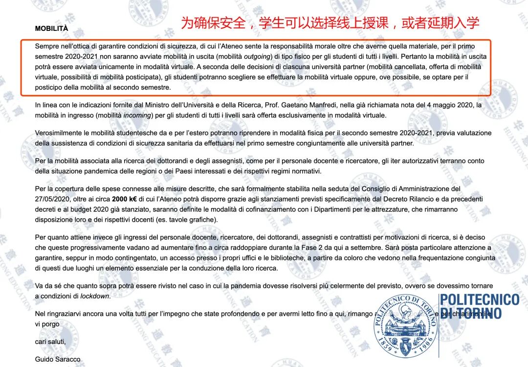 和米兰理工大学一样,学生可以选择线上授课,或者延期入学。