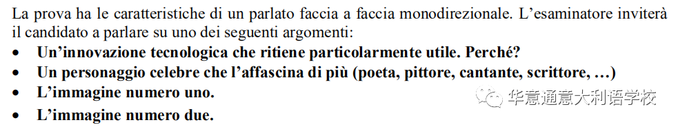 我的老师也是CILS考官,她建议我们在这个部分最好选择话题,因为她见过很多考生在讲图片的时候讲完图上有什么就没有话说了,语言显得苍白,贫乏。而且描述图片需要用到虚拟式的句型,比如mi sembra che... 更容易出错。