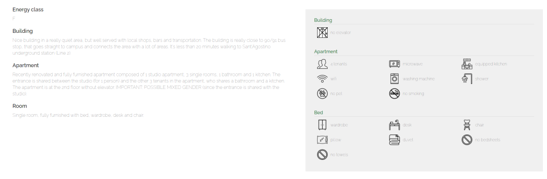 出于对每个学生信息的保护NABA无法共享其他租户的详细信息。但所有的租户都是学生,安全性可以保证,并且从房间的介绍中你也可以知道这是几人宿舍。所有公寓都是性别单一的(男性或女性-非混合宿舍)。