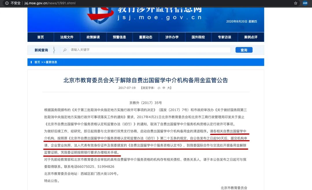 也就是说从2017年开始,涉外监管网就不会再管留学中介了,之前涉外监管网颁发的《自费出国留学中介服务资格认定书》,已经没用了,而且从2017年开始就停止更新了。